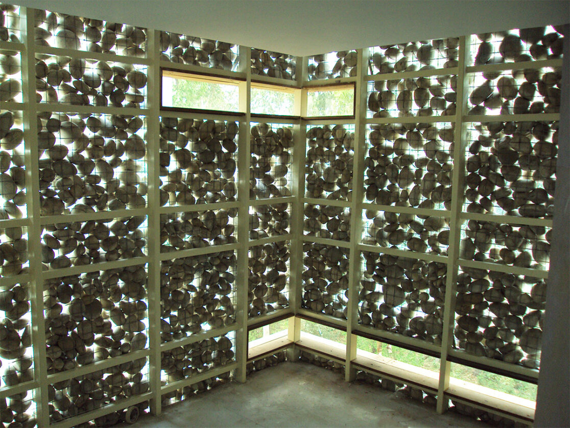 The tiling pattern of the wood-clad guestroom block is evinced as minimal fenestrations in the river stone gabion of the meditative spaces and is carried further onto a layer of stone slabs that acts as the brise-soleil for the monolithic block at the rear.