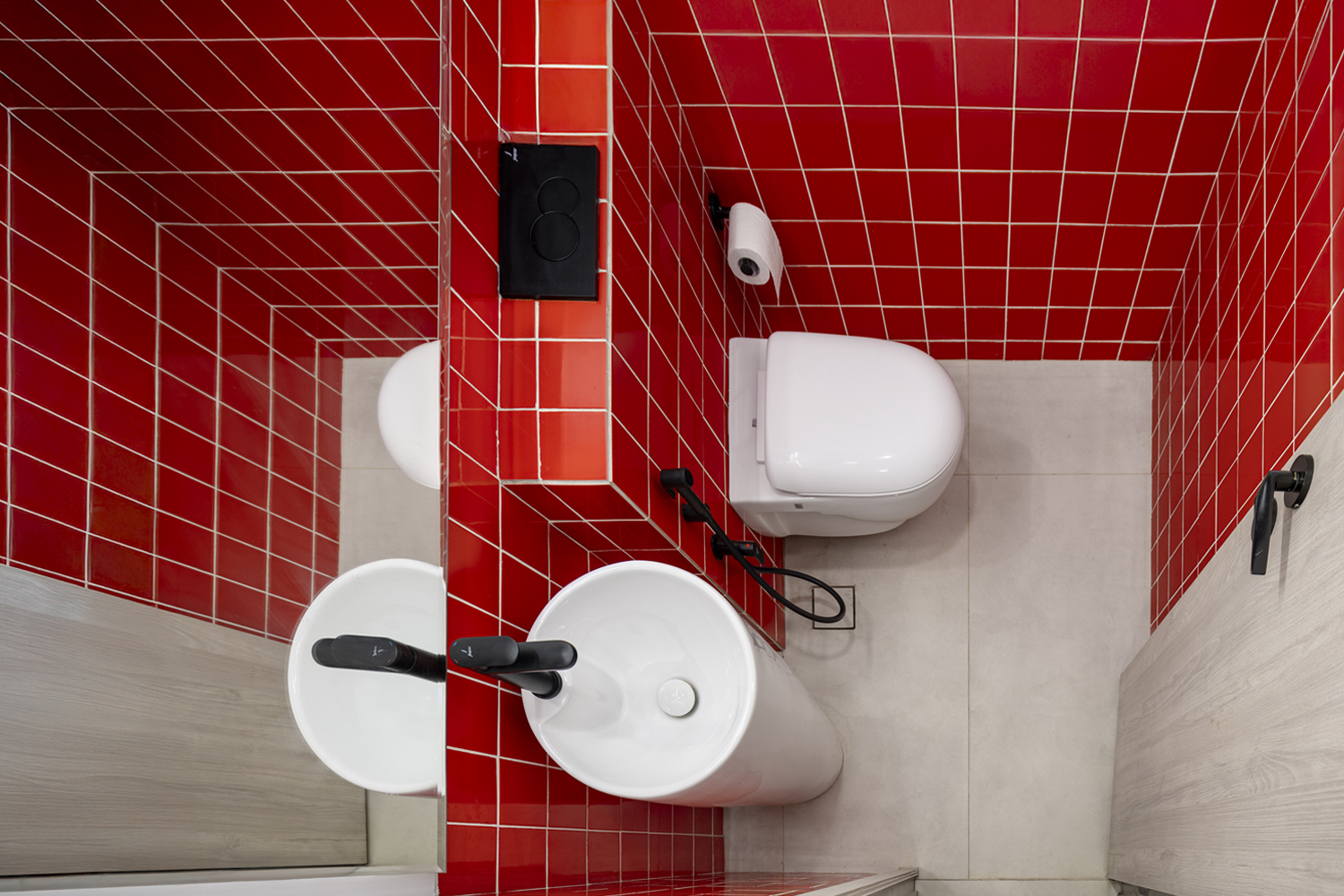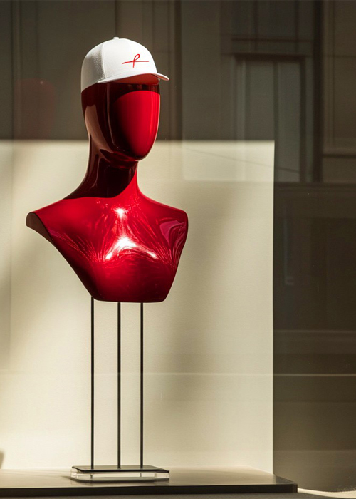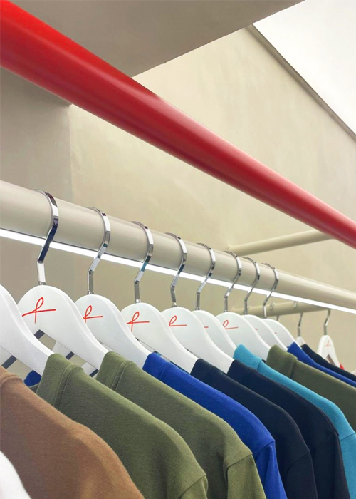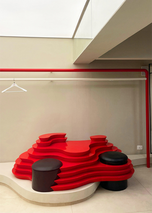 The layout of the store facilitates an intuitive flow while the material palette reinforces the brand’s core values. Neutral tones soften the space, providing a serene backdrop that allows the products to take center stage. Strategic accents of the brand’s hallmark red infuse energy into the space: the sweeping display rod, sculptural bench, and abstract logomark at the far end.