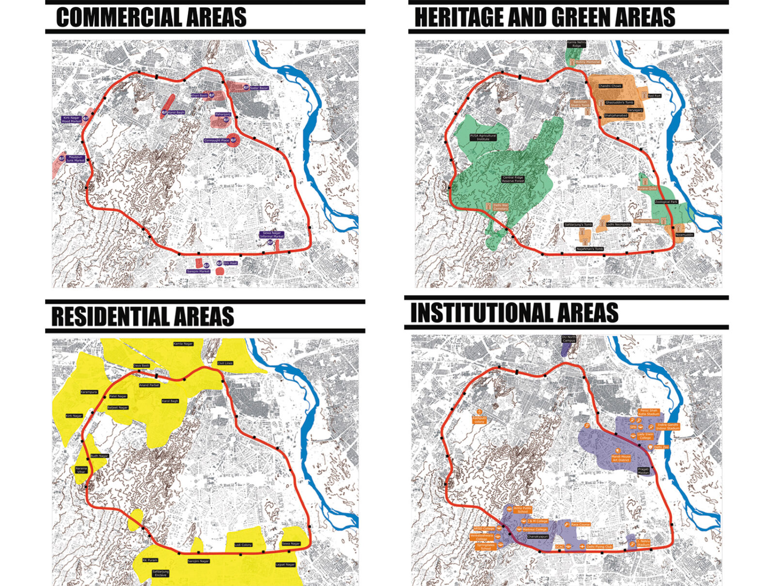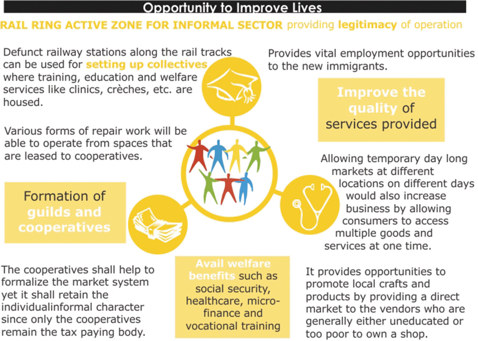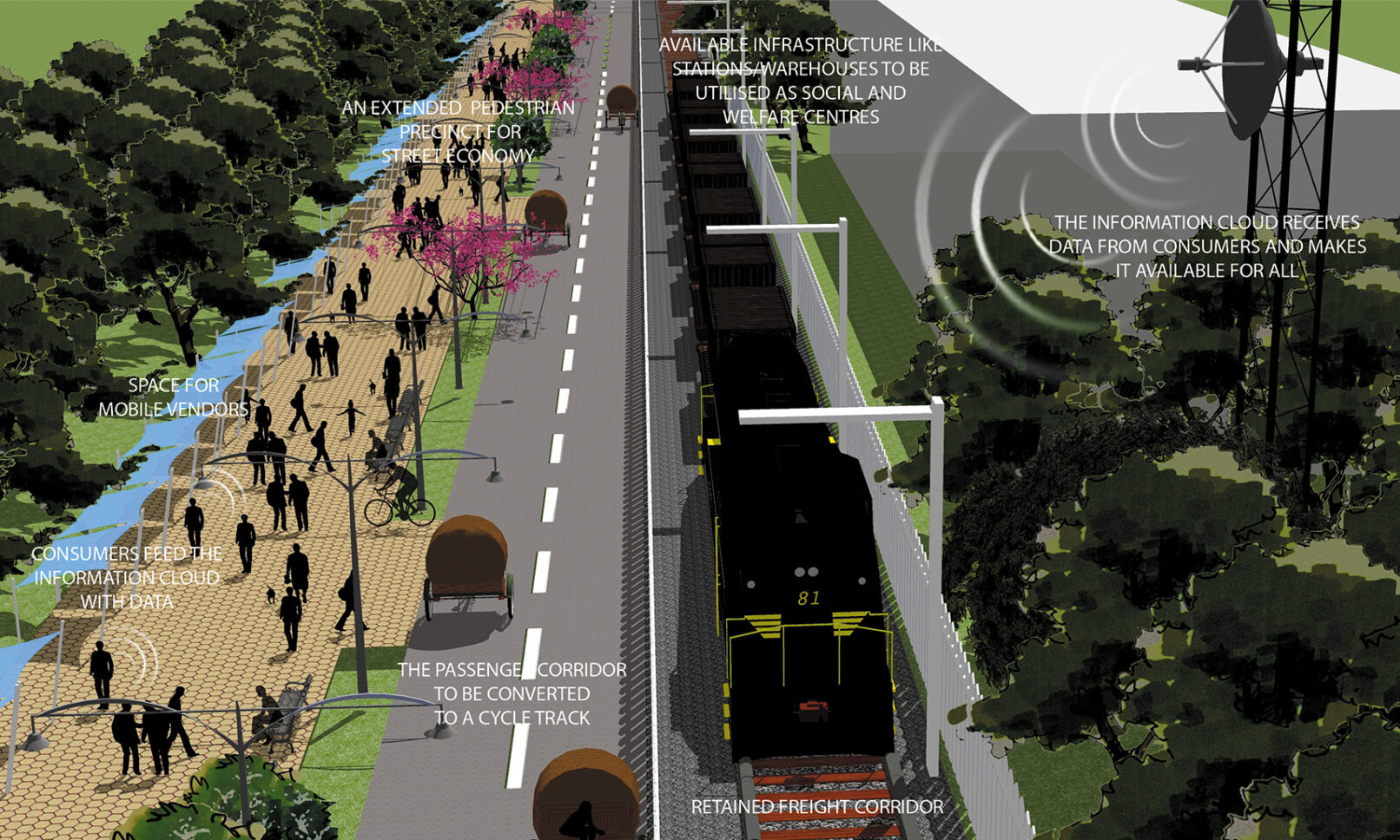 The project has been envisaged as an urban context additional to its functional role as a segregated shunting line. This project imagines the Ring beyond the Rail. It puts forth the idea of creating a contiguous belt that is human powered, a precinct that is pedestrian, cycle friendly and abuzz with urban activities that are rapidly losing their legitimate place in an increasingly car centric city. A zone that is not only close to the city’s centre but could potentially be close to its heart. The project also seeks to legitimize the informal sector, recognizing its valuable contribution to the city economy and culture It encourages creation of cooperatives in the unorganized sector, which ensures them access to social and welfare infrastructure like health, education and micro finance. These cooperatives ensure them access to social and welfare infrastructure facilities like health, education, etc. Further the rail corridor proves to be an excellent site for establishing an information cloud accessed through basic and most ubiquitous mobile technology (1G) which has witnessed a deep penetration into the city population (across income groups). The cloud empowers peer to peer recommendation, the age old system that drives the informal sector, with cheap new age technology wherein which people can rate, tag and exchange information. The benefits are reaped by all stakeholders by activation of an urban space through slow transit and street economic activities. The project enhances the engagement of the people with the physical environs of the city. The technological model hence developed and the reclamation of the urban space has universal application.